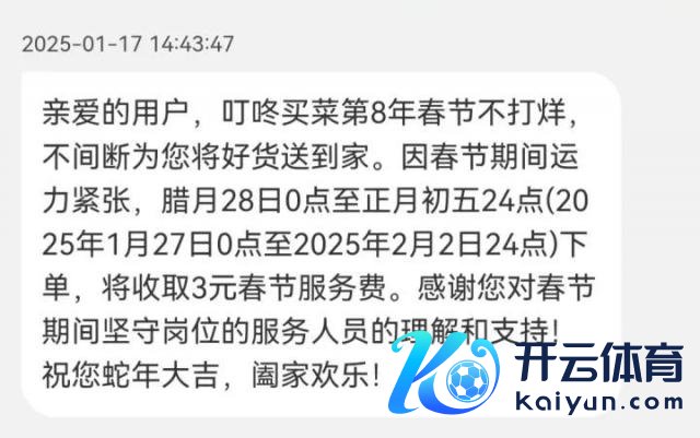 叮咚买菜默示,因春节技巧运力垂危,腊月 28 日 0 点至正月初五 24 点(2025 年 1 月 27 日 0 点至 2025 年 2 月 2 日 24 点)下单,将收取 3 元春节劳动费。