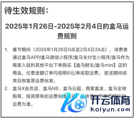 盒马发布见知称,2025 年 1 月 26 日 0 点至 2 月 4 日 24 点,所灵验户(含 X 会员)通过盒马 App 或盒马第三方小活动等,线高下单购买盒马门店的商品,随心金额订单均收取 6 元 / 单运脚,具体盒马门店界限见备注。