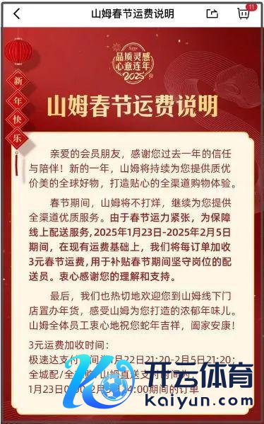 日前,山姆在 App 首页公布了春节运脚诠释:由于春节运力垂危,为保险线上配送劳动,2025 年 1 月 23 日— 2025 年 2 月 5 日历间,在现存运脚基础上,每订单加收 3 元春节运脚,用于补贴春节技巧信守岗亭的配送员。