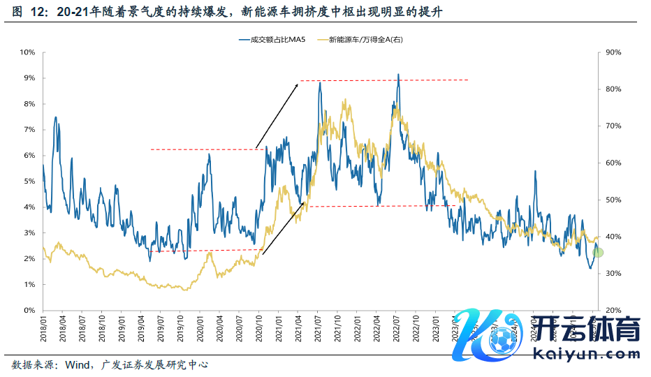 参考已往基本面驱动的新兴产业发展阶段,如果有事迹的公司大齐爆发,那么市集对于短期心思温煦度下降,更聚焦于基本面的变化。比如20-21年的新动力车,伴跟着基本面的爆发,成交占比的上限也被进一步盛开,核心从3%-6%上移到4%-9%,原有的指点效果也有所弱化。