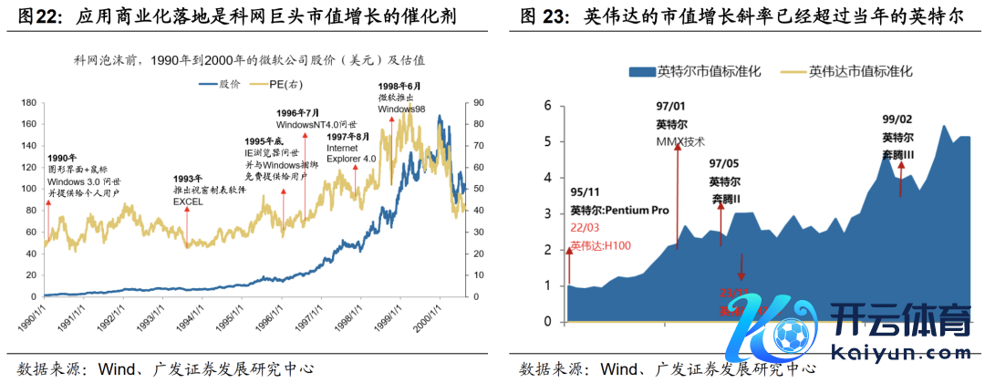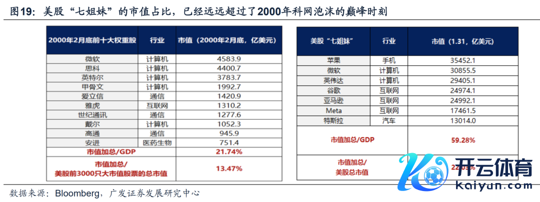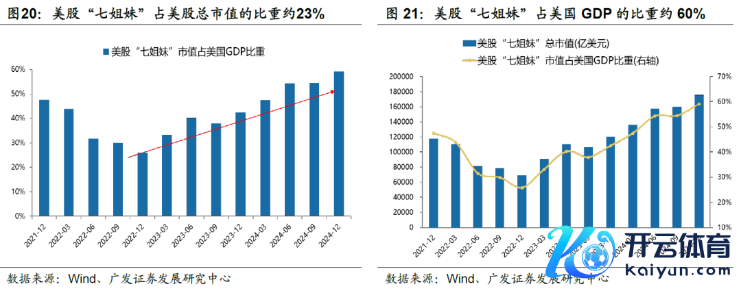 已往2年,东谈主工智能所带动的新一轮专家通用技能翻新,好意思国一直当作技能的率先主体并握续处于上风地位。对此,国外股市映射对此的订价口舌常积极的,已往2年专家资金涌入并推升好意思股“七姐妹”的市值急速增长。截止25年1月31日,好意思股“七姐妹”市值占好意思股总市值的比例达到22%,占好意思国GDP比重接近60%,相较于22年底齐出现了翻倍以上的扩张。参考1996-2000年好意思国科网泡沫阶段,买卖化落地、广谱的通用技能浸透是估值泡沫化最快的时期。不外,这一轮七姐妹的市值扩张斜率,依然格外了上一轮科网巨头的可对标时期。