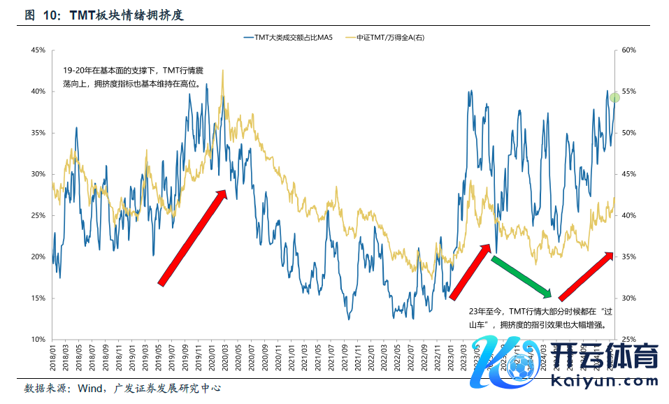 在已往两年中,当作哑铃策略的紧迫一端,成长板块在大部分时候并不是握续性行情,背后的原因在于枯竭基本面握续的爆发,因此心思拥堵度就组成了行情择时的有用目的。如果不雅察TMT的逾额收益可以看到,在19-20年专家半导体周期进取、无线蓝牙耳机销售放量的支握下,在基本面的改善下,TMT逾额收益是震憾上行的;比较之下,23年于今,尽管AI、机器东谈主、低空经济等多个场地尽管反复表露契机,但更多是偏主题性质,除了光模块有较强的事迹撑握之外,大部分场地齐莫得事迹的杀青,这也导致行情“过山车”(下图黄线逾额收益),当作揣度心思演绎进度的拥堵度目的(下图蓝色线)效果大幅提高。