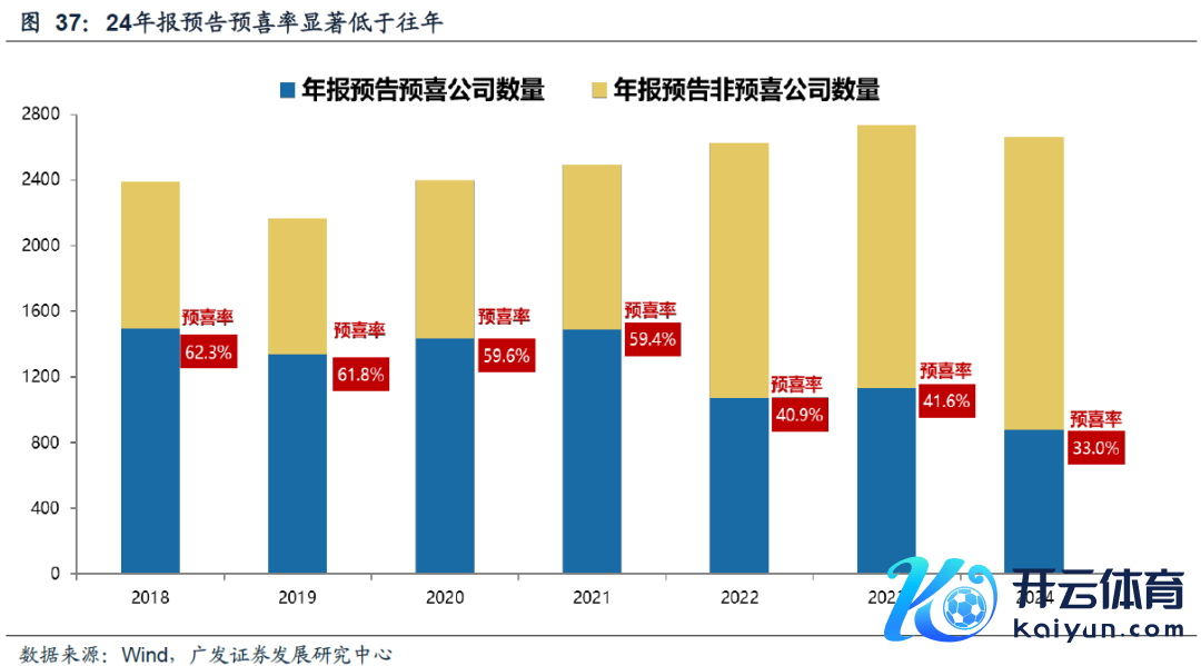 当作预喜的公告类型,2018-2023年报预报中预喜公告的占比永诀是62.3%、61.8%、59.6%、59.4%、40.9%、41.6%,而2024年年报事迹预报的预喜率为33%(880/2661),本年的预喜率彰着低于往年。