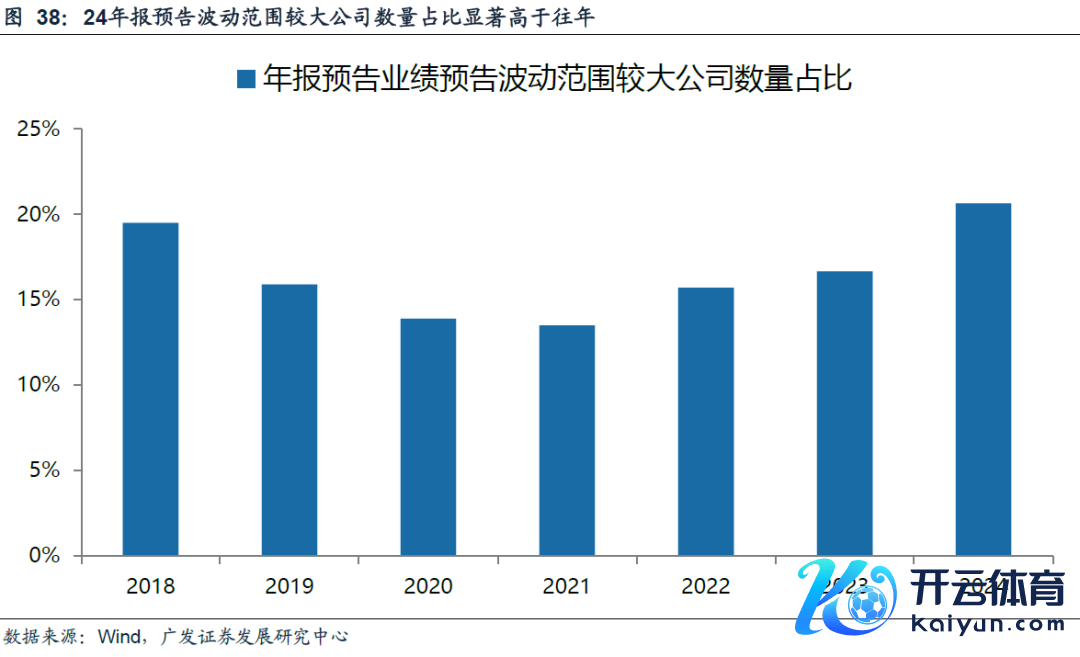 咱们以(事迹预报上限-事迹预报下限)/事迹预报下限目的揣度上市公司事迹预报波动范围,如该值较大说明该公司事迹预报范围较宽,指挥性较差。咱们将该目的>40%的公司称为事迹预报波动范围较大的公司,24年年报事迹预报波动范围较大公司占比达20.6%,权臣高于往年,因此本年度事迹预报的参考性较为一般。