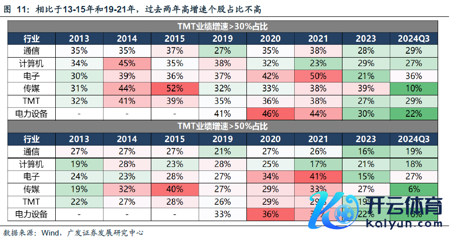 而在已往2年中国AI产业发展中,A股大概“出事迹”的公司数目占比,与13-15年的出动互联网产业,19-21年的新动力产业比较,仍然大幅不足。如果用事迹增速大于30%或者大于50%来当作高增长个股圭臬,15年传媒高增长占比个股达到40%-50%,21年的新动力也在35%-45%。比较之下,已往两年景长场地的TMT,高增长个股占比遍及不高,尤其是24年,远远低于13-15年的TMT和19-21年的新动力。