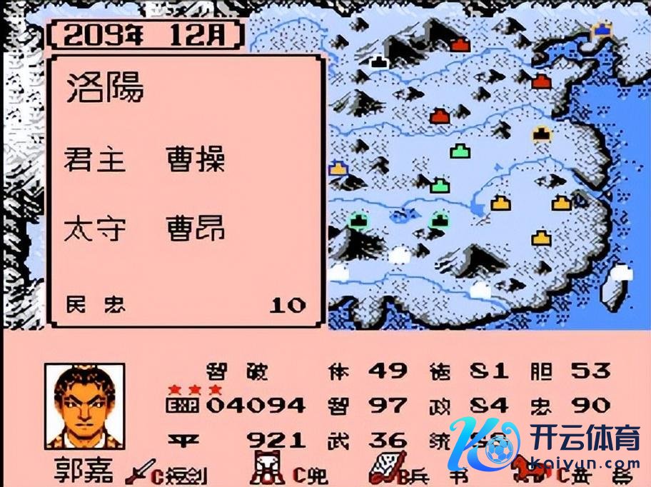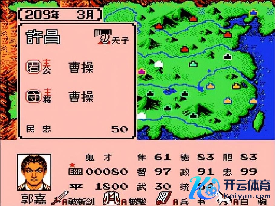 公共好,我是游戏阿诺。在《三国志》游戏史上体育游戏app平台,除了那些能征善战的猛将,还有一类东说念主物相似令玩家酣醉——那即是靠机灵旋转乾坤的智囊。 淌若说周瑜是儒将典范,那么今天的主角郭嘉,则是“奇谋鬼才”的代名词。 今天,咱们就来细细试吃郭嘉在《霸王的大陆》游戏中的成长之路,望望这位三国第一“预言家”是如安在数据的宇宙里一步步封神的。 第一代:华夏之霸者 在初代《三国志1》中,郭嘉的形象不错说是“耳不忍闻”。 属性:体49,智93,武10,德73。 这个数据面板,险些是个“白面书生”的模