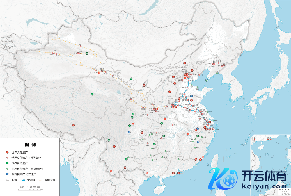 在中国世界遗产别离图上,一个个小圆点犹如能干明珠点亮中原地面。