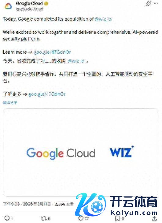 DoNews3月11日音讯开yun体育网,谷歌告示,已完成对网罗安全公司 Wiz 的 320 亿好意思元(现汇率约合 2200.49 亿元东谈主民币)全现款收购交往,Wiz 即日起肃肃加入谷歌云。这是谷歌设立 26 年来限制最大的一笔收购,记号着其在云筹划与东谈主工智能期间加码安全布局的计策决心。 谷歌云霄示,在刻下 AI 快速发展的布景下,云安全的首要性日新月异。Wiz 提供的平台大概匡助客户在千般云服务之间保护数据安全,其本领才智将与谷歌云造成深度协同。 “在现在的 AI 期间,越来越多的